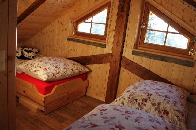Sie hat ein Doppelzimmer im Erdgeschoß und im OG sowie ein 3 Bett Schlafraum im Obergeschoß mit TV auf der offenen Galerie. Obergeschoß - Kniestockhöhe 170 cm. Weiters gibt es ein Bad mit Waschbecken, WC und Dusche mit Regenhimmel im Keller (nur von außen zu begehen), ein WC mit Waschbecken im Erdgeschoß und für die "echten Almliebhaber" einen Wassertrog und ein Plumpsklo hinter der Hütte. Außerdem befindet sich in der Hütte eine bestens ausgestattete Küche mit Holzherd, Backrohr und einem Geschirrspüler. Eine große Sitzecke für 8 Personen sorgt abends für Gemütlichkeit. Es gibt auch einen Abstellraum für Ski oder Fahrräder und eine Waschmaschine.