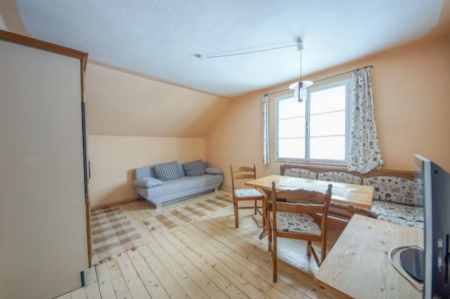 Die Wohnung liegt im zweiten Stock des Haupthauses und bietet auf 48 m2 Wohnfläche alles was Sie für den Urlaub brauchen. Sie hat ein Doppelschlafzimmer mit Doppelbett, eine Wohnküche und ein Bad mit Wanne und WC. In der Wohnküche befindet sich ein ausziehbares Sofa für nochmals 2 Personen (€5/Nacht/Person). Zur Wohnung gehört ein Balkon – hier können Sie abends sitzen und der untergehenden Sonne über den Bergen zusehen. Oder Sie setzen sich in den gemütlichen Gastgarten und bei kühlerem Wetter in die kuschelige Stube vor den Kamin.