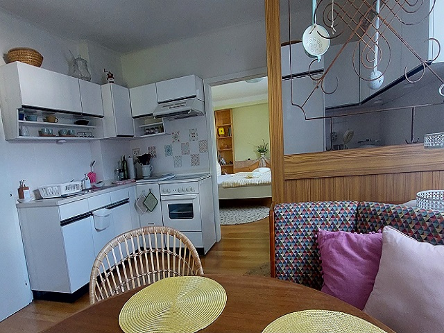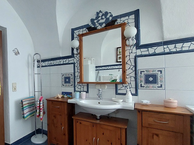 Ein geräumiger Vorraum, ein großes Badezimmer, einer voll ausgestatteten Küche mit einer gemütlichen Ecksitzbank und einem runden Esstisch, zwei Schlafzimmer mit je einem King Size Doppelbett, zwei Kleiderschränken und Kommoden sowie einem Arbeitszimmer mit einem kleinen Schreibtisch stehen ihnen zur Verfügung.